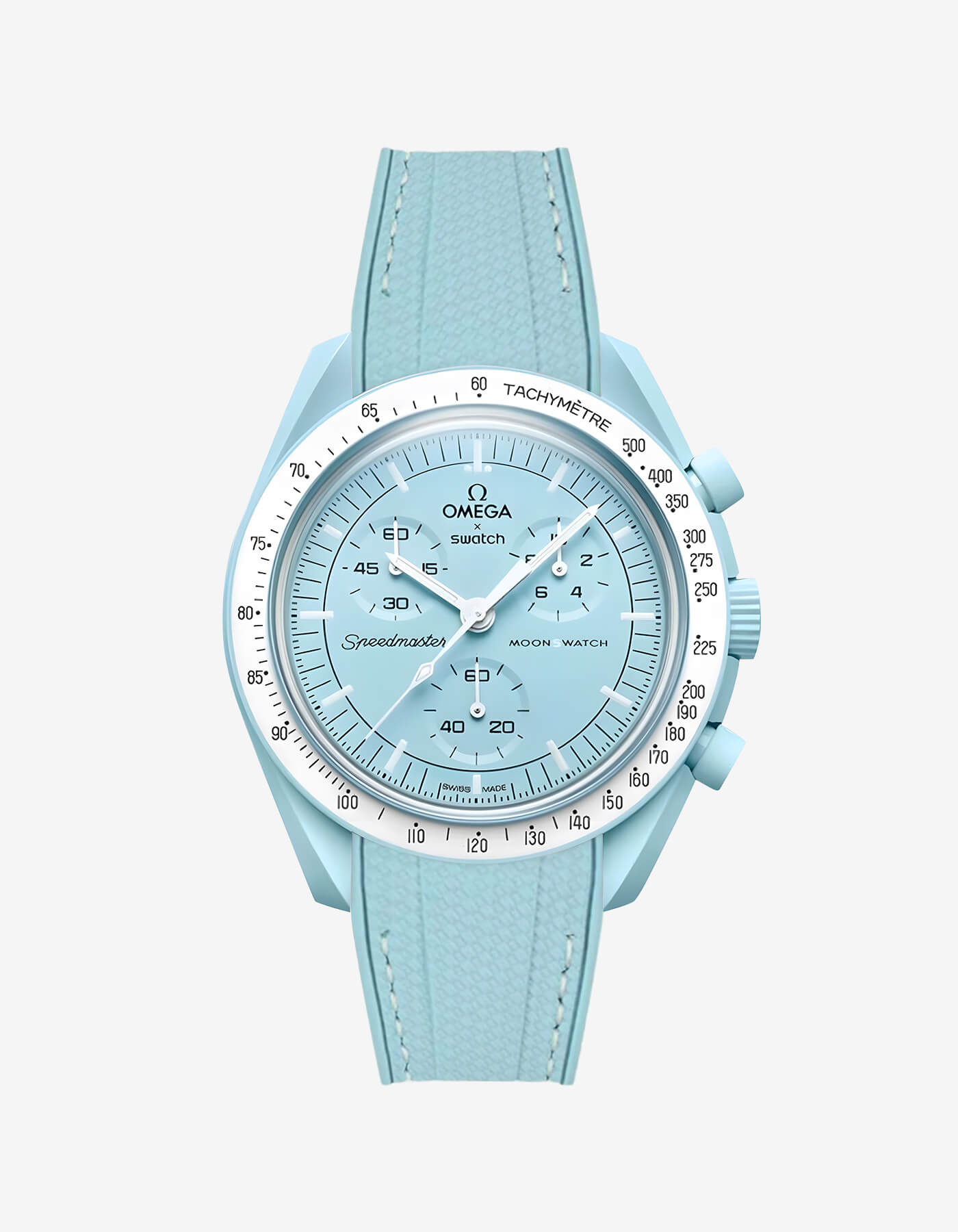 Premium liquid silicone rubber strap for the Omega X Swatch MoonSwatch. Durable and comfortable to wear, it accentuates the colors of the watch. Textured surface with contrasting stitching for a stylish look.